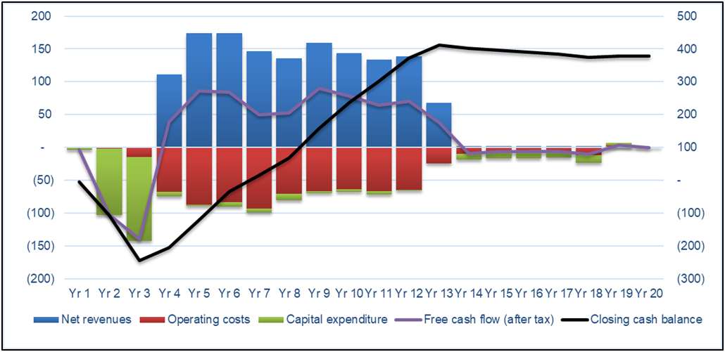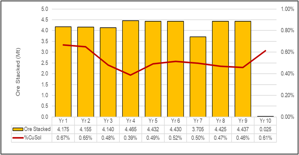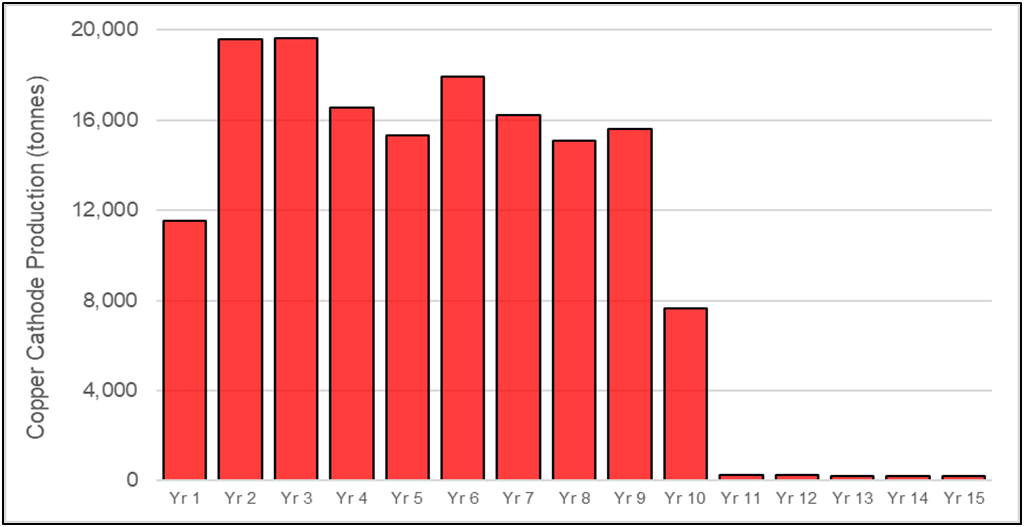 The charts below show the Life of Mine (LOM) production (Figure 1) and cash flows after tax (Figure 3). Ore mined is slightly lower in years 1-3 as higher grades of soluble copper are mined first (Figure 2), delivering strong early-stage cash flows to the project. The LOM strip ratio is low at 1.37:1, adding to the high margin and highly profitable project.