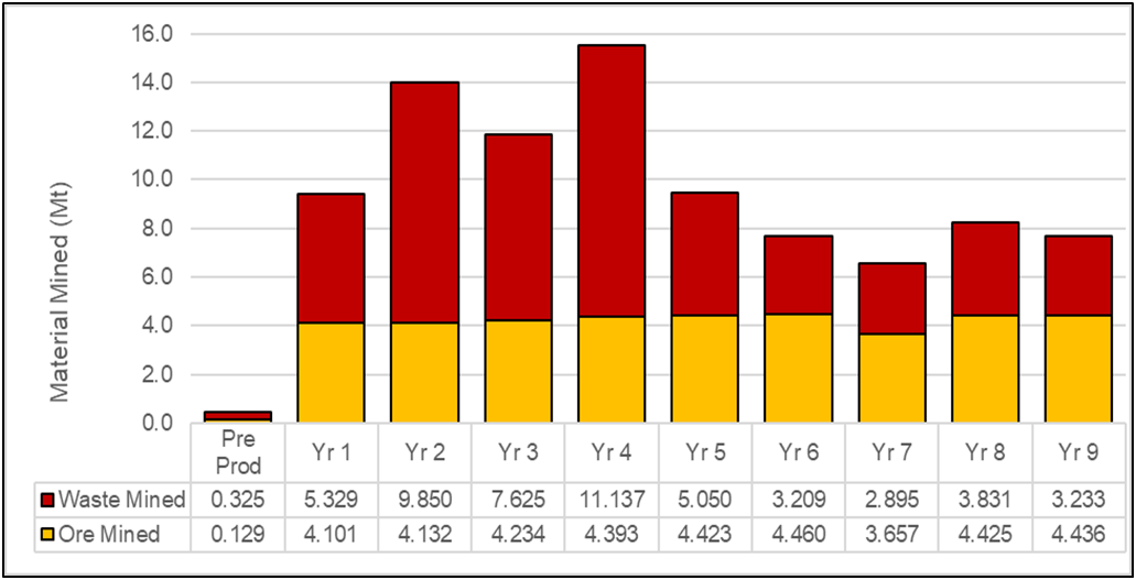 The majority of the mining works, namely site preparation, blast hole drilling and load and haul requirements will be performed by a primary mining contractor. Some smaller pieces of the mining scope will be completed by support contractors. The mining LOM cost is forecast to be $3.37 per tonneof material mined inclusive of mine geology (including dedicated grade control) and ancillary mining activities.